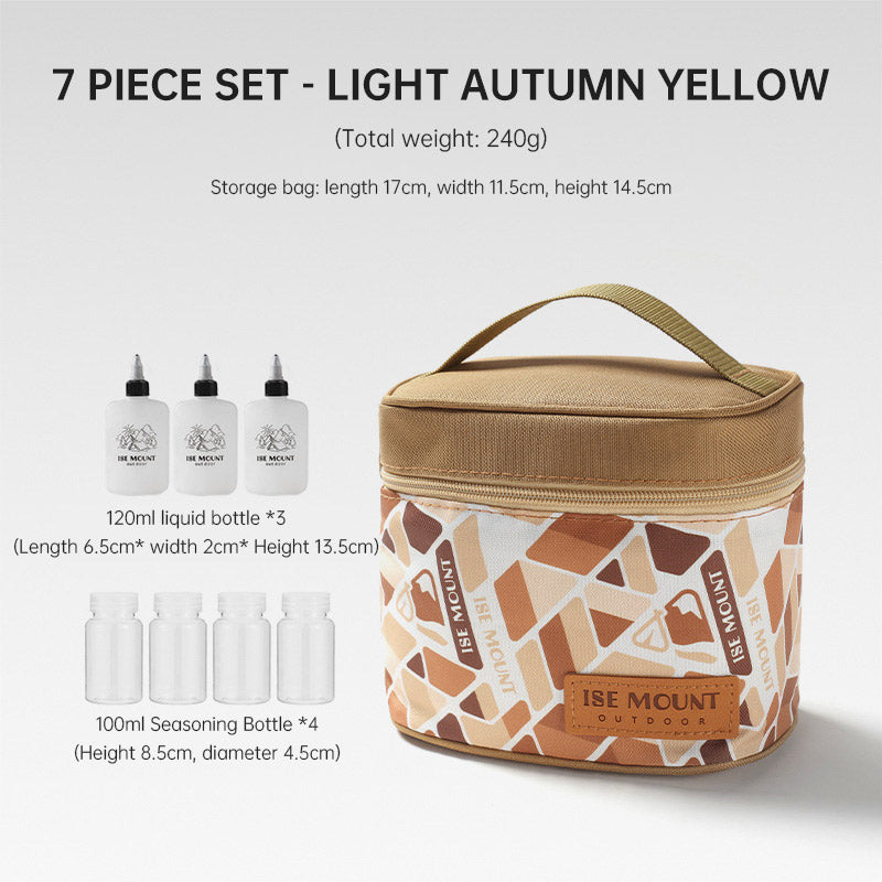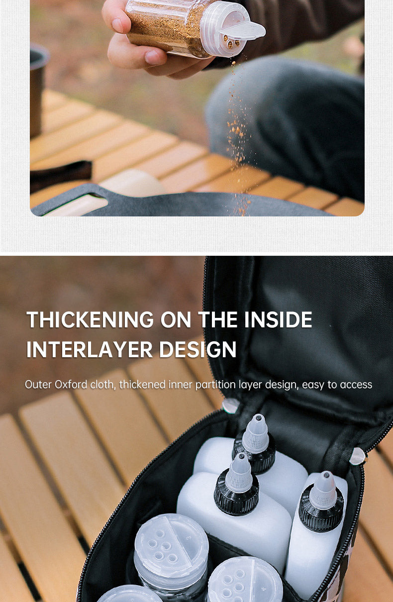 Keep your spices organized and accessible on every outdoor adventure with this 7-piece seasoning storage set. Designed for camping and BBQ enthusiasts, the portable bag holds seven seasoning bottles securely, preventing spills and saving space. Durable and compact, it simplifies meal preparation by keeping your favorite seasonings neatly stored and ready to use wherever you cook. Ideal for enhancing flavors while on the go.